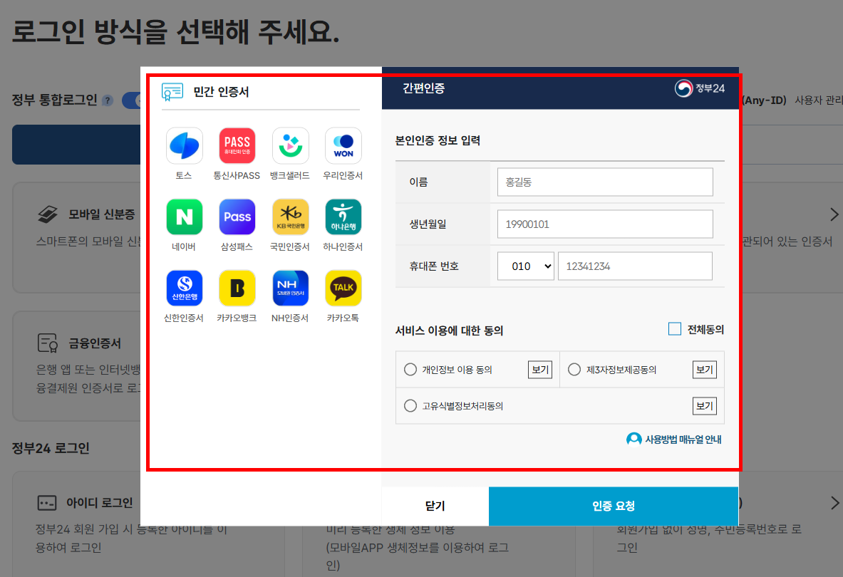 - 민간인증서(PASS, 카카오, 네이버 등)